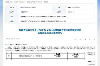 日前,厦门市商务局根据《厦门市商务局外贸自主品牌培育三年(2021-2023)行动方案》(厦商务规〔2021〕3号)的有关要求,经过层层审核,公布第二批厦门市外贸自主品牌培育企业名单,四信入选该榜单。